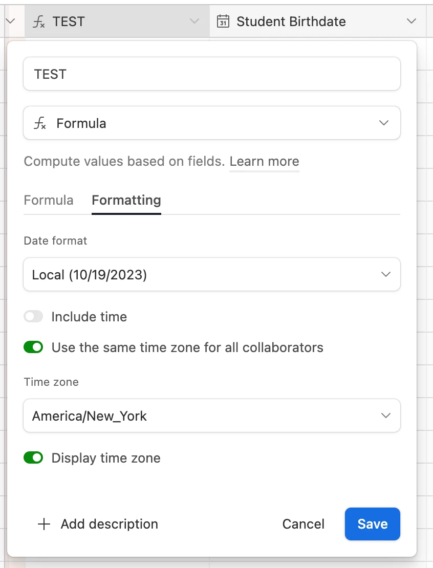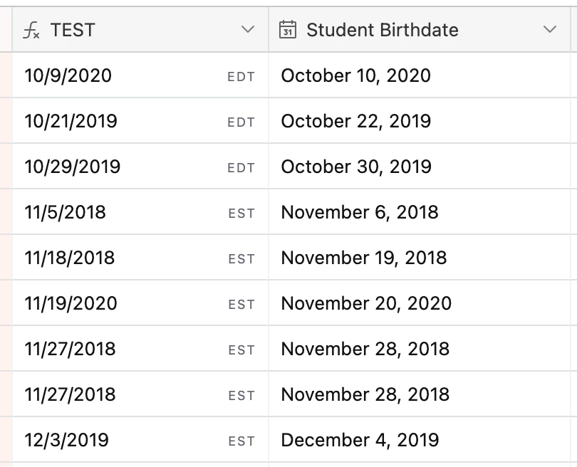 A year or so ago I started getting reports that some dates shown in our dashboard interface were off by 1 day. E.g. if the entered birthday was Dec 10, the interface would show Dec 9. (This may have correlated with when Airtable made some changes to the way they handled dates/timezones internally?)