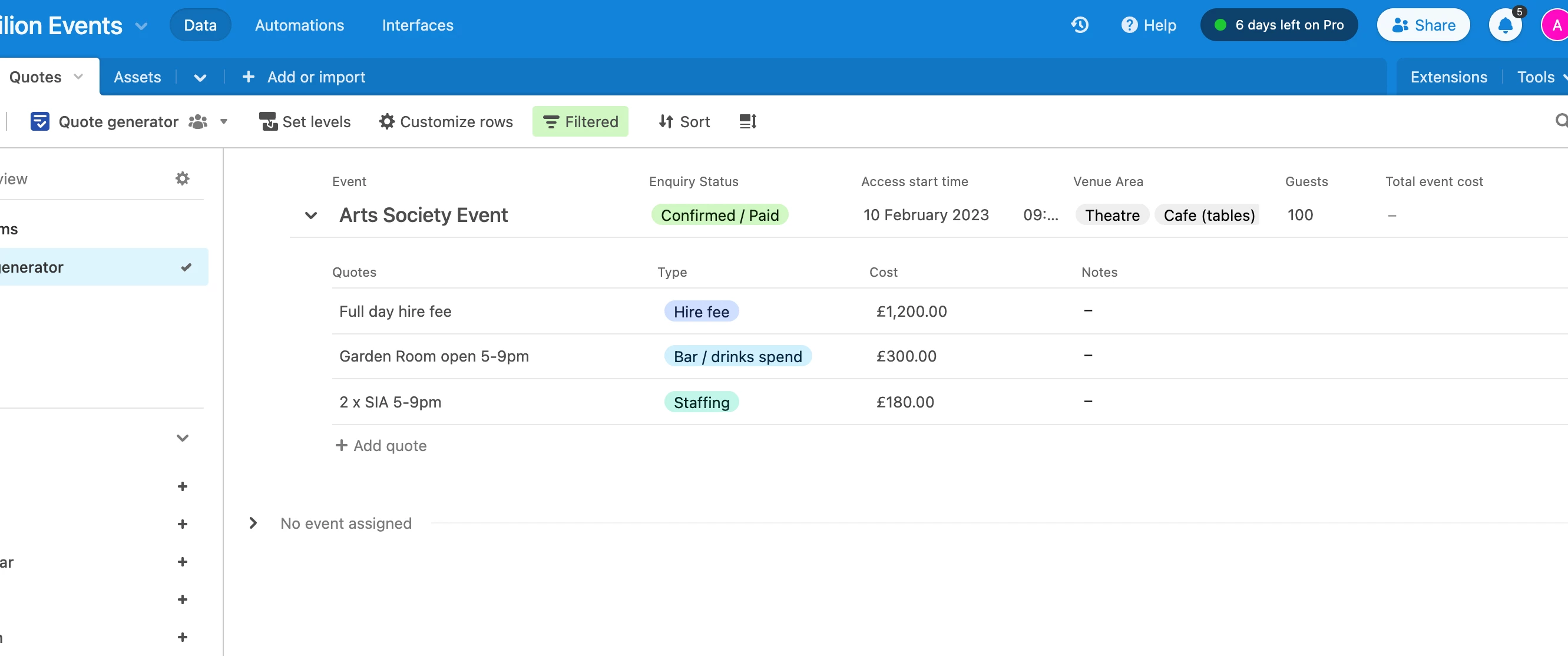 I am trying to use the new list view to create a system for putting together quotes for events.