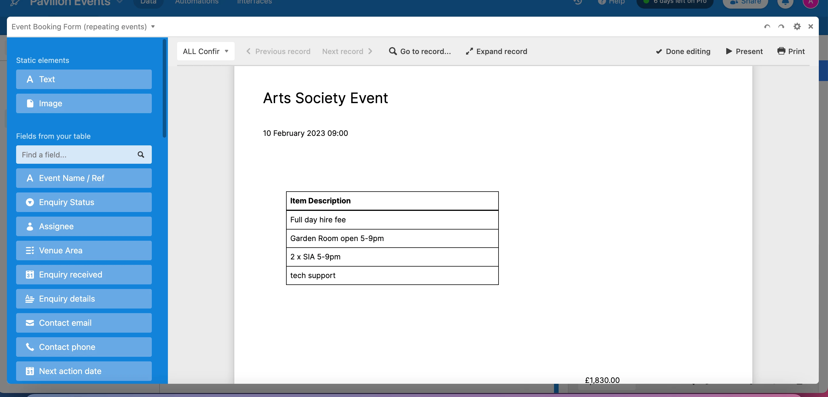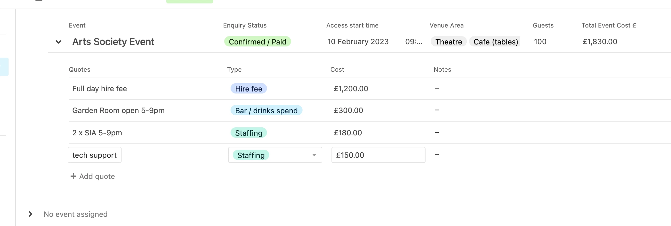 I have a list of event enquiries in table 1, and in table 2, have created a list view, where I am adding line items to events using levels.