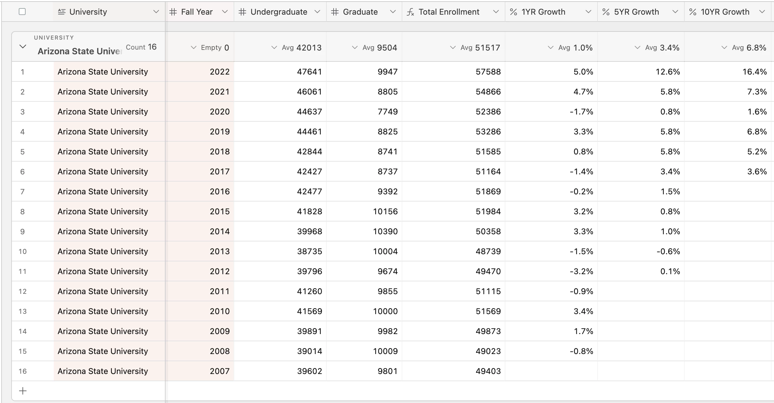 While this is easy to do with a vlookup in Excel (i.e. matching University, Fall Year and Total Enrollment with Fall Year-1, Fall Year-5, Fall Year-10), I'm struggling with a finding solution here in Airtable.