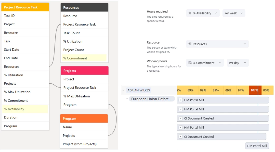 What is the calculation behind the Timeline Utilization summary? I am trying to create a formula column that displays a resources utilization in the Resources table, to be used as a metric on a landing page.