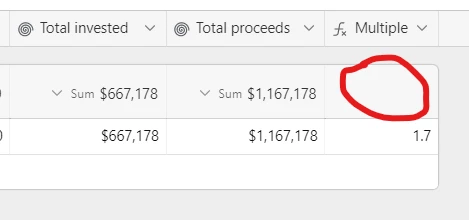 Each investment's multiple is calculating just fine but I cannot figure out a way to calculate the firm's total multiple as it is not simply a sum of the multiples, it has to be recalculated at the firm level (i.e. sum of all proceeds on sale / sum of all costs). I want to be able to calculate this number based on pivots/groups/filters. For example if I wanted to know the multiple based on investments made in a certain geography or industry.