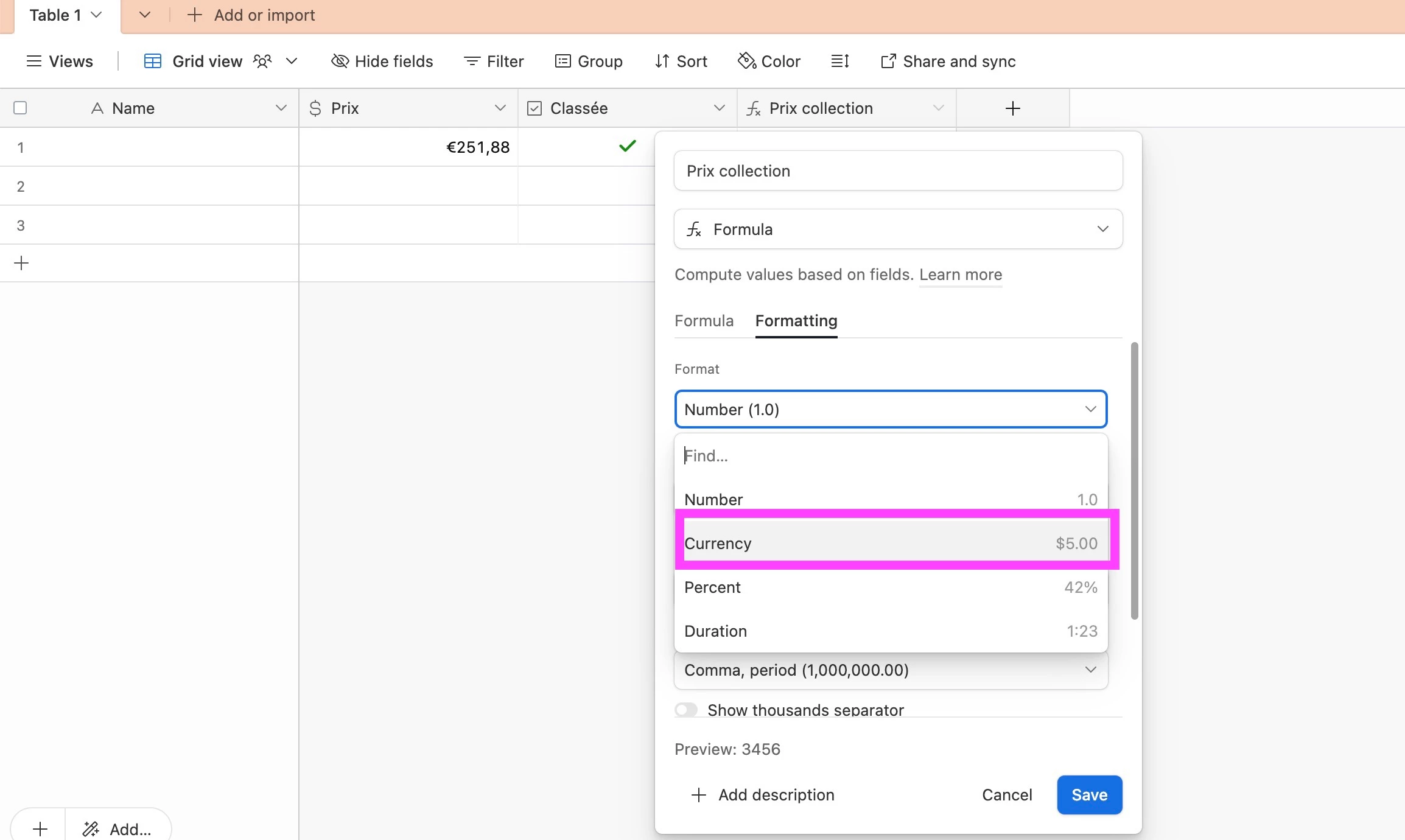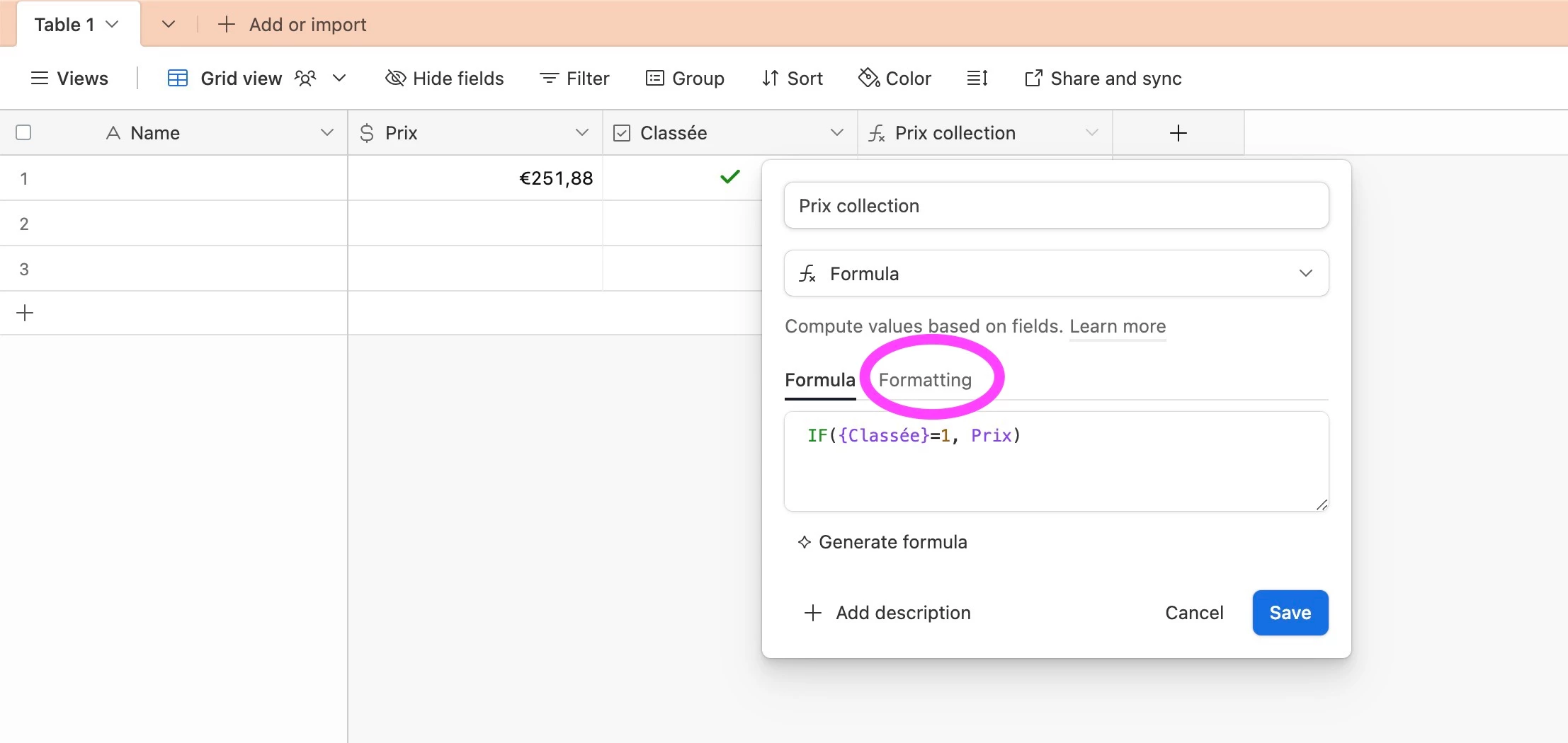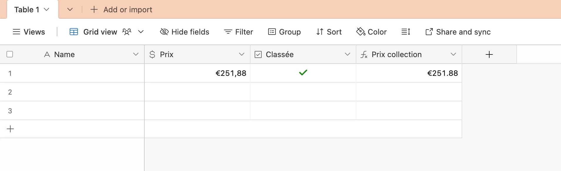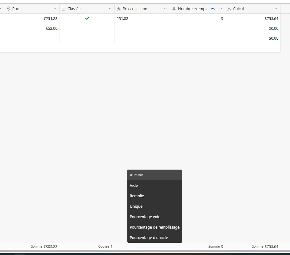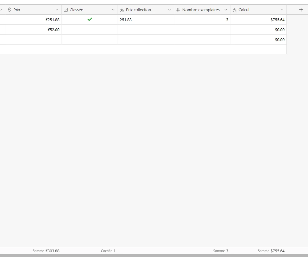 Je souhaite lier la colonne case à cocher : Classée, avec la colonne Prix, pour que dans la colonne : Prix collection, apparaître le prix uniquement si j'ai coché.