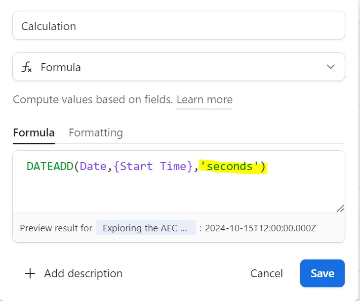 I've searched on the community for solutions to combining one field that contains a date and another field with a duration to create a datetime field, but haven't come across any solutions to solve it. I'm using the DATEADD() formula but Airtable is not returning a correct results. What am I missing?