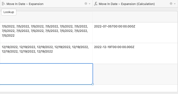 I have a lookup field that lists multiple dates multiples times (the same day in each respective record). Like so: 10/10/2022, 10/10/2022, 10/10/2022, 10/10/2022. This is the "Move In Date ~ Expansion" Field.