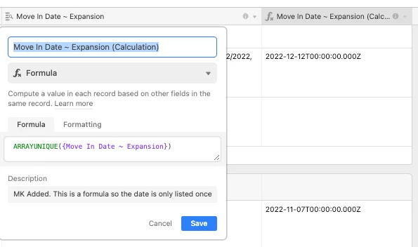 I only want one date listed and clean like so "MM-DD-YYYY". So I created a Formula Field ("Move In Date ~ Expansion (Calculation)" Field and did an ARRAYUNIQUE formula, however, it shows up with additional 0's and is not clean. How can I adjust this formula so that it lists the date of the lookup field only once and clean like so"MM-DD-YYYY"? Or does anyone have any other solve here? Thank you!