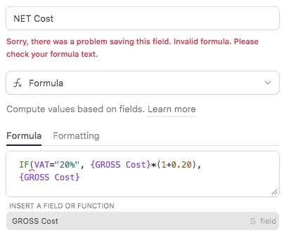 I currently have a VAT Field that is a single select field with options None and 20%. I'm trying to write a conditional formula for the NET Cost that is based on the VAT field and essentially works as follows: