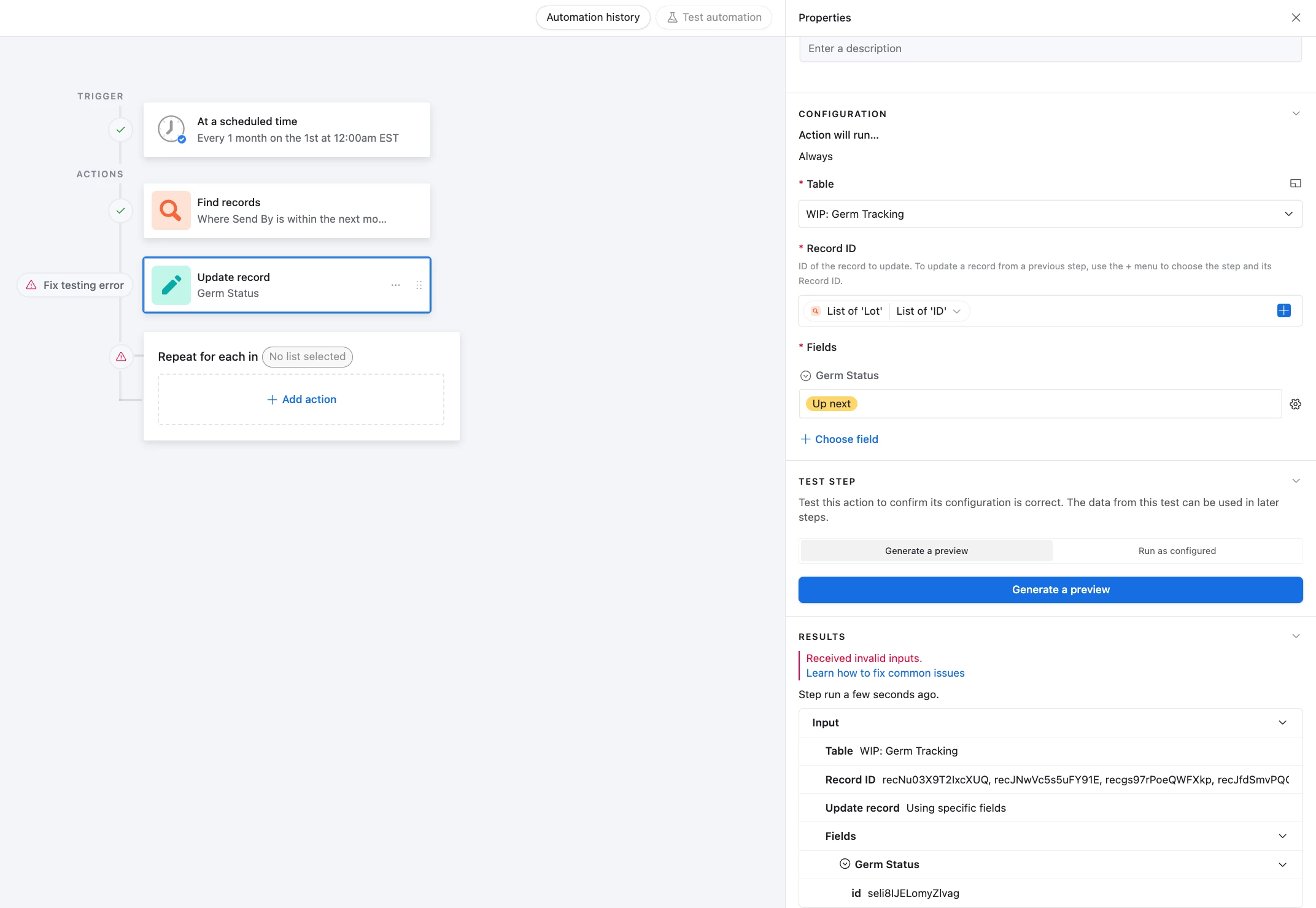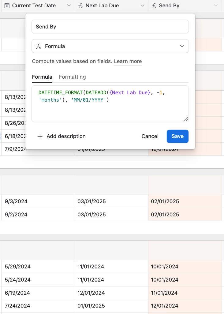 1. (automation or formula?) When we enter into a given month, I would like for any records with a Send By date in that month to automatically update the Lab Status to 'Up Next'. For example, on February 1st any record with a Send By date in february gets its status changed to 'Up Next'. For now I've tried to set all the dates to be the first of the month to more easily batch them.