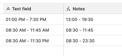 Hi! Trying to figure out how to make a field that turns these times into a 24hr format. I’ve tried 2 different time formats examples (01:00 PM - 7:30 PM) as well as (3-8 PM). I’m have a hard time figuring out a formula that will display that in a 24hr format? Any ideas?