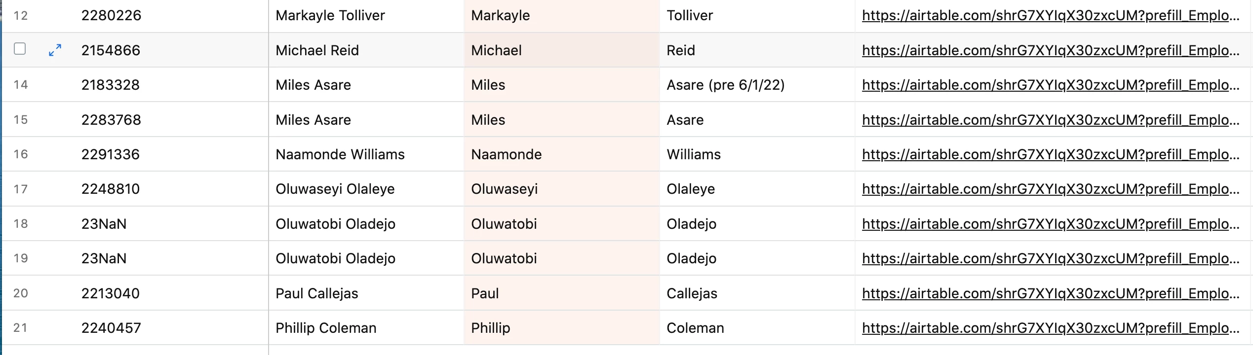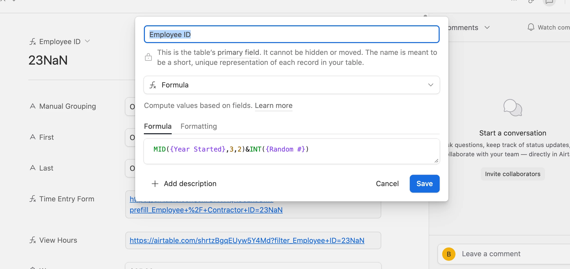 We use airtable to track employee hours and payroll. A former employee set up our base so I'm a bit unfamiliar how to make changes to the boards within airtable. However, I have two new employees that I'm trying to generate a random employee ID number for and can't get a number to generate. I'm not completely sure where to go to make the changes. When I go to add a new employee to the base, a "number" generates but it has both numbers and letters, I'm looking for a pure number. Screenshots attached. Any help would be extremely appreciated