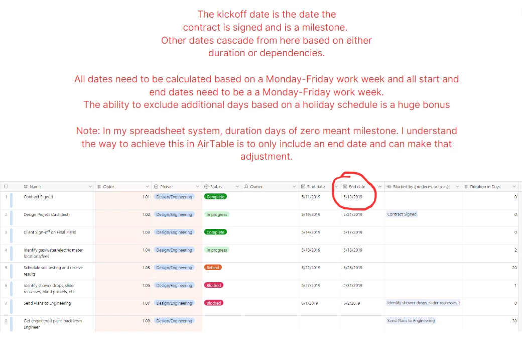 - The project has a kick-off date and all start and end dates cascade from there based either on the duration of the task or a a dependency.