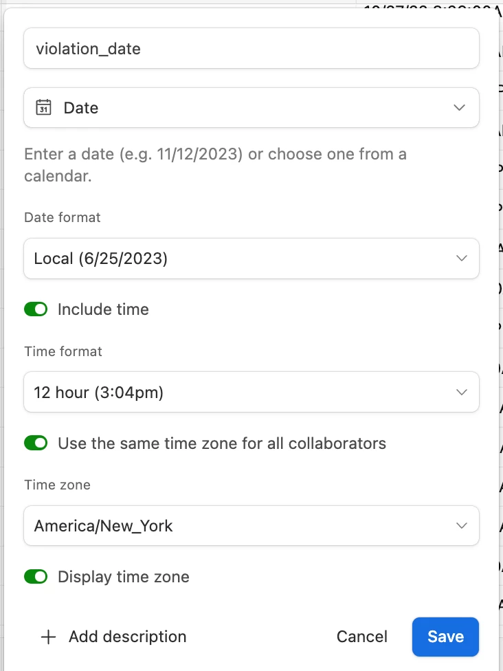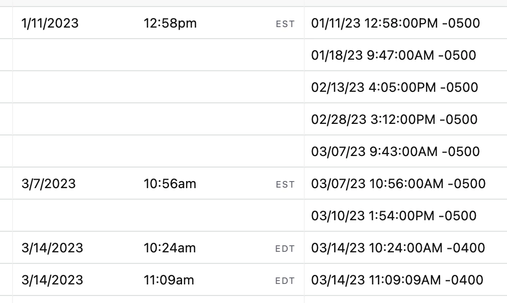 I have data that I am importing from a CSV. Sometimes it will import into my date field without issues, and other times it will simply be blank. In the screenshots I have attached, the left column is an Airtable date field (screenshot of settings attached) and the right column is the raw date data for comparison. I am trying to determine why some data will format correctly and others don't, but I can't seem to find any correlation.