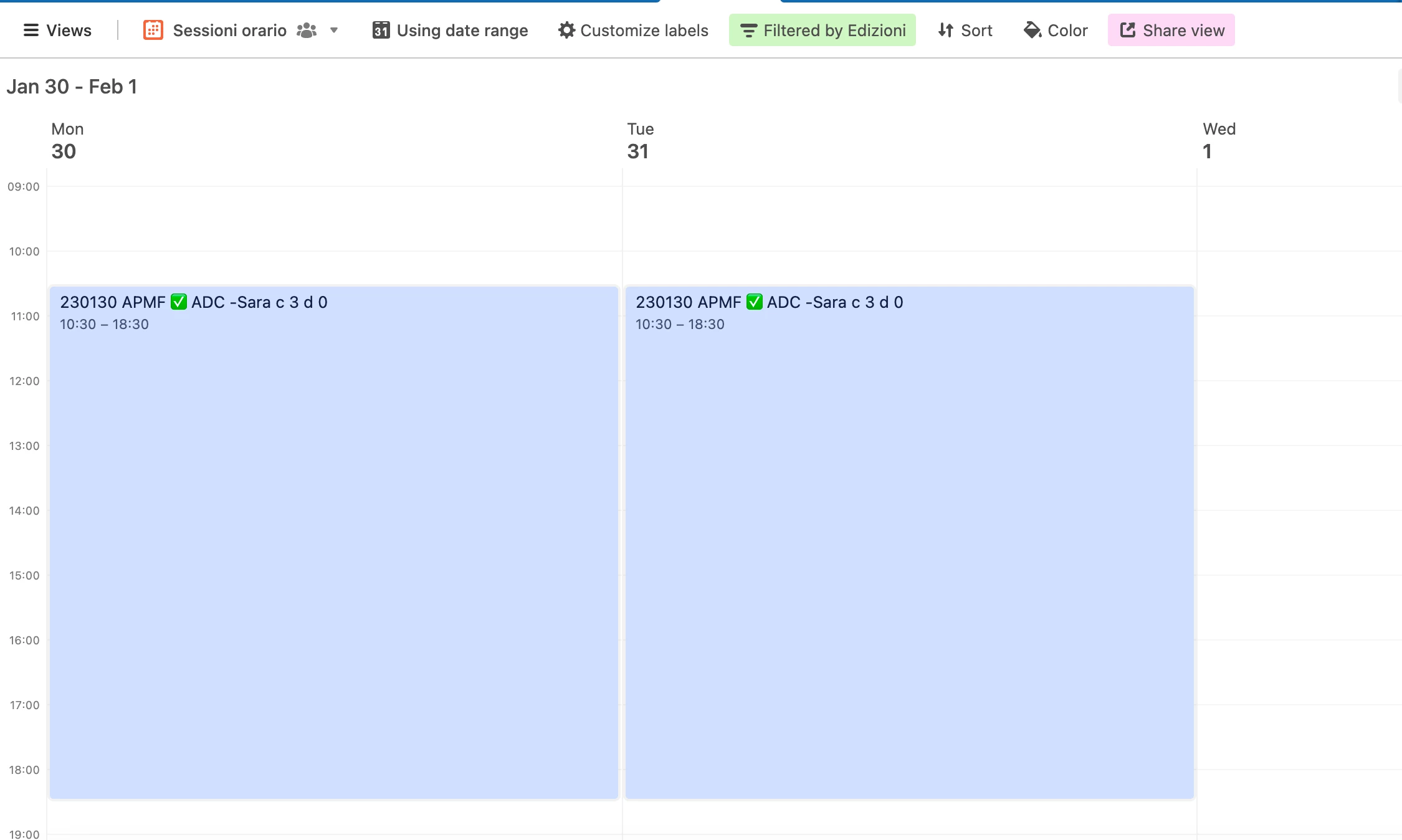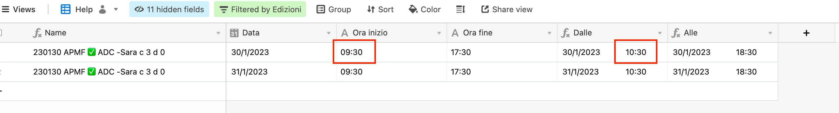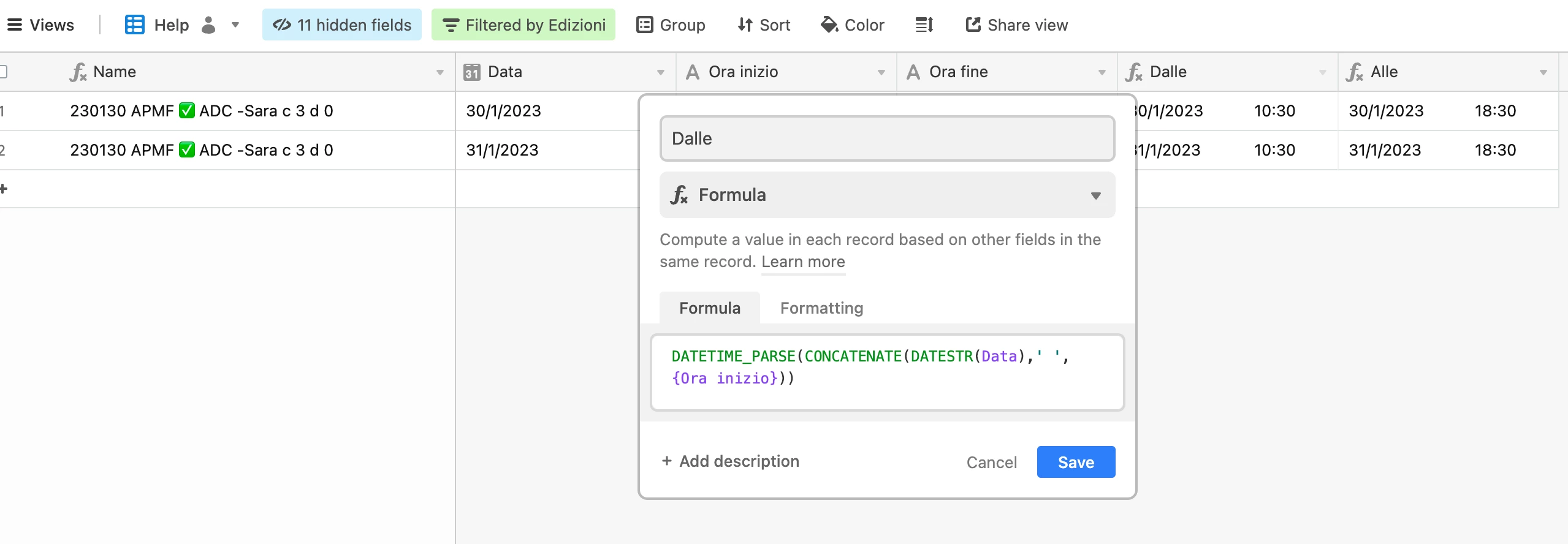 I have to create a calendar of course sessions and I have a table in which I enter in one column the date, in one column the start time and in another column the end time because different days might have different times.