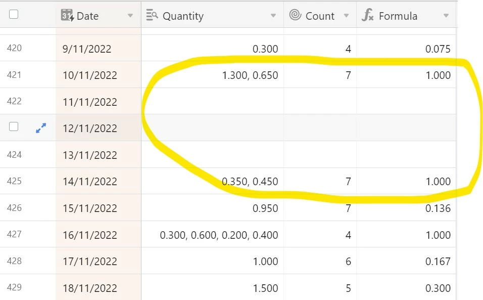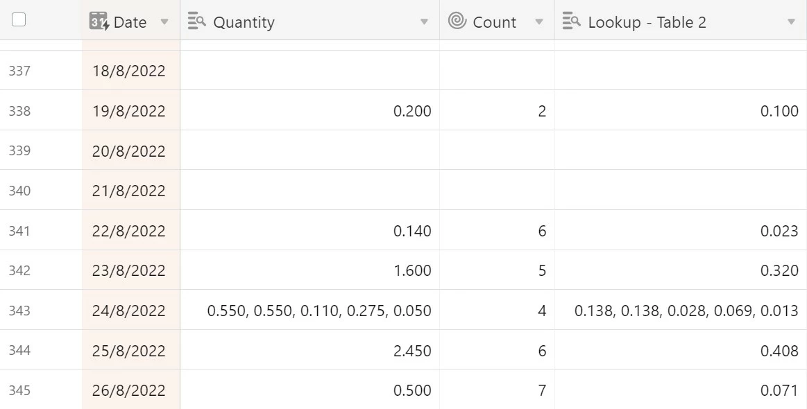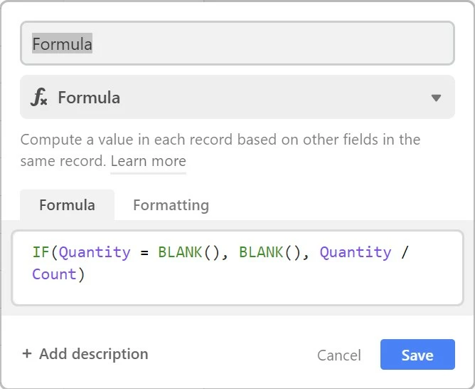 On the other hand, if you want to divide the *sum* of the {Quantities} by the {Count}, you could turn the {Quantity} into a rollup field with the formula SUM(value). Then you would have only one value in the {Quantity} field.