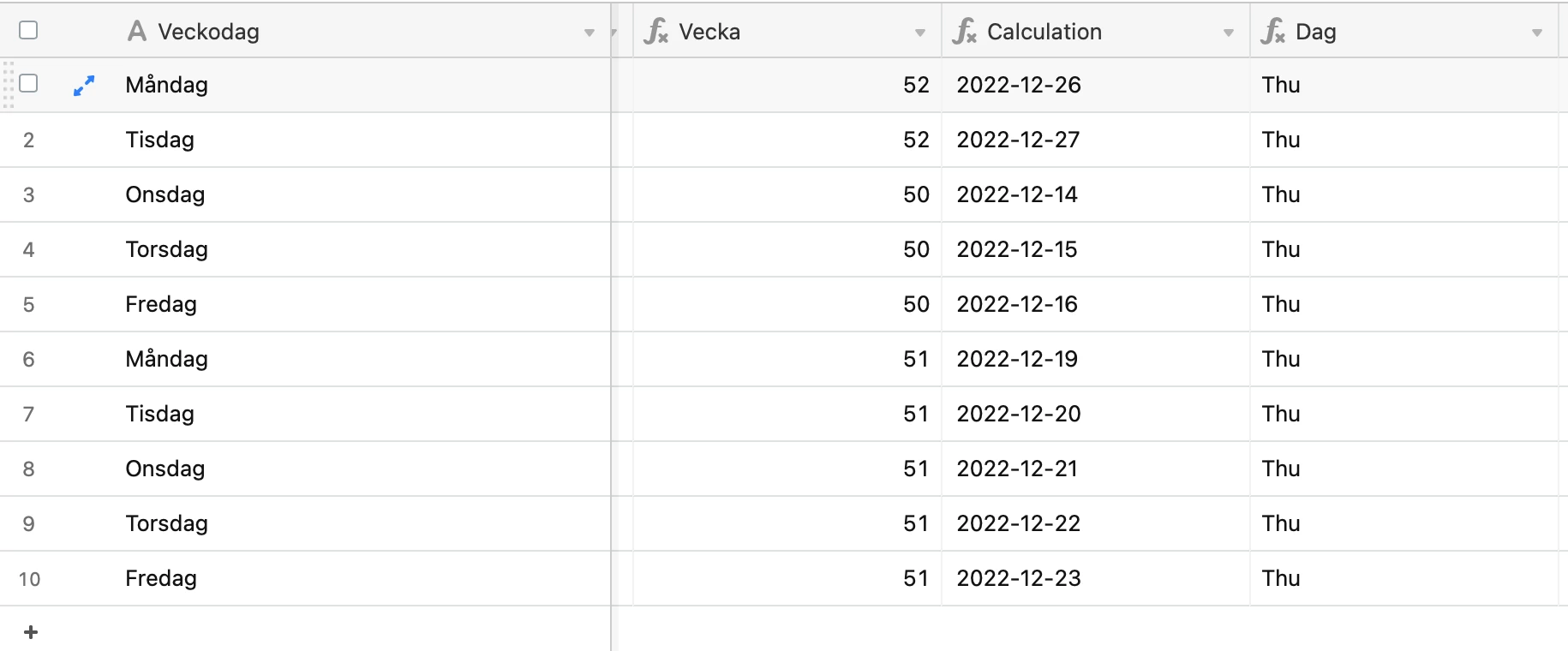 I want to show in a field in the even table (week 50), lets say today Wednesday the 14th of dec. I want todays date to be visible in that field, on Tuesday the 13th should be visible and on tomorrow the 15th and so on. And I also want if the dates in the odd table shows next weeks date, and then when it becomes an odd week the even table updates the dates to the week after the odd. Any of you geniuses have a solution in mind?