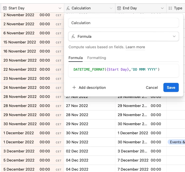 DATETIME_FORMAT({Start Day}, 'DD MMM YYYY')