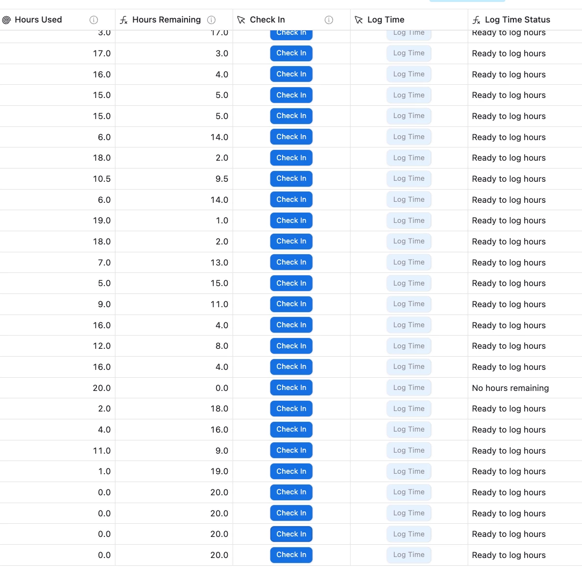 I created a Check-In button that uses a formula, and it was working fine for a couple of weeks. However, it recently stopped pulling and autofilling the “Time Card” field. I also have staff use our interface to check in and log time for hours used on the time card.