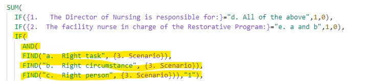 I need help creating a formula for scoring a quiz that I am making in Airtable. The questions are a combination of single select and multiple select. There are 100 questions total and each question is worth 1 point if answered correctly. The multi-select questions must be answered exactly right to get 1 point, otherwise they get 0. I am running into a problem with the multiple select questions in the formula. With the way I have it written, it will count 1 point if all three of the correct selections are selected in any order. BUT if one of the incorrect selections are selected in addition to the three correct selections, it is still counting 1 point. How can I tell it that if any one of the incorrect selections are selected that the score should be 0? In this particular example A, B, & C are correct. D and E are incorrect and should not be selected for them to get the point. The highlighted area in the attached formula is the part of the formula for the multi select question. The other attachment is an image of the quiz question. In order for the user to get 1 point they need to select the three red responses.