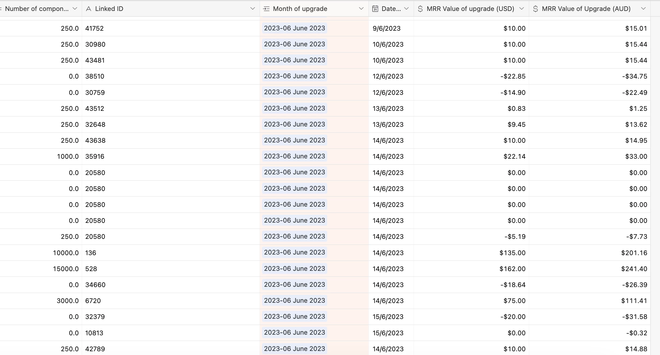 I have a table that tracks subscriptions for a specific product add-on. It tracks subscription movement for this product based on the unique account business id. Every time a user subscribes, upgrades, downgrades, or churns it adds a record with the new quota, business id, date of upgrade, month of upgrade, and the expansion or contraction MRR.