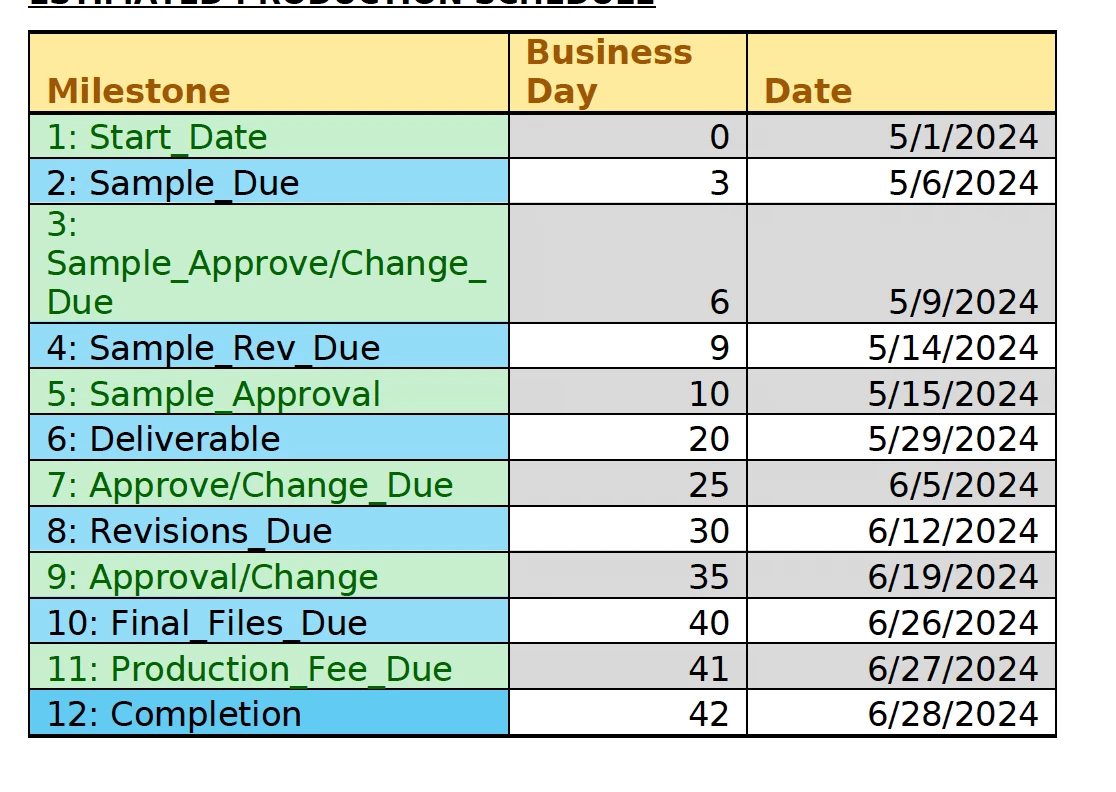 I receive a due date and have to calculate backward to identify different milestones in our projects. What formula(s) do I need to use to make this work? I've attached a picture of what I'm trying to do.