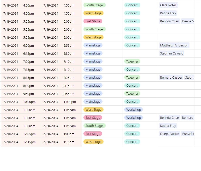 I'm looking for some complex scheduling help. I'm using Airtable to schedule a multi stage music festival, and we're hoping to have a formula that will look for scheduling conflicts for individual performers at specific times.