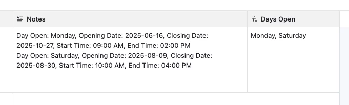 Day Open: Monday, Opening Date: 2025-06-16, Closing Date: 2025-10-27, Start Time: 09:00 AM, End Time: 02:00 PM Day Open: Saturday, Opening Date: 2025-08-09, Closing Date: 2025-08-30, Start Time: 10:00 AM, End Time: 04:00 PM