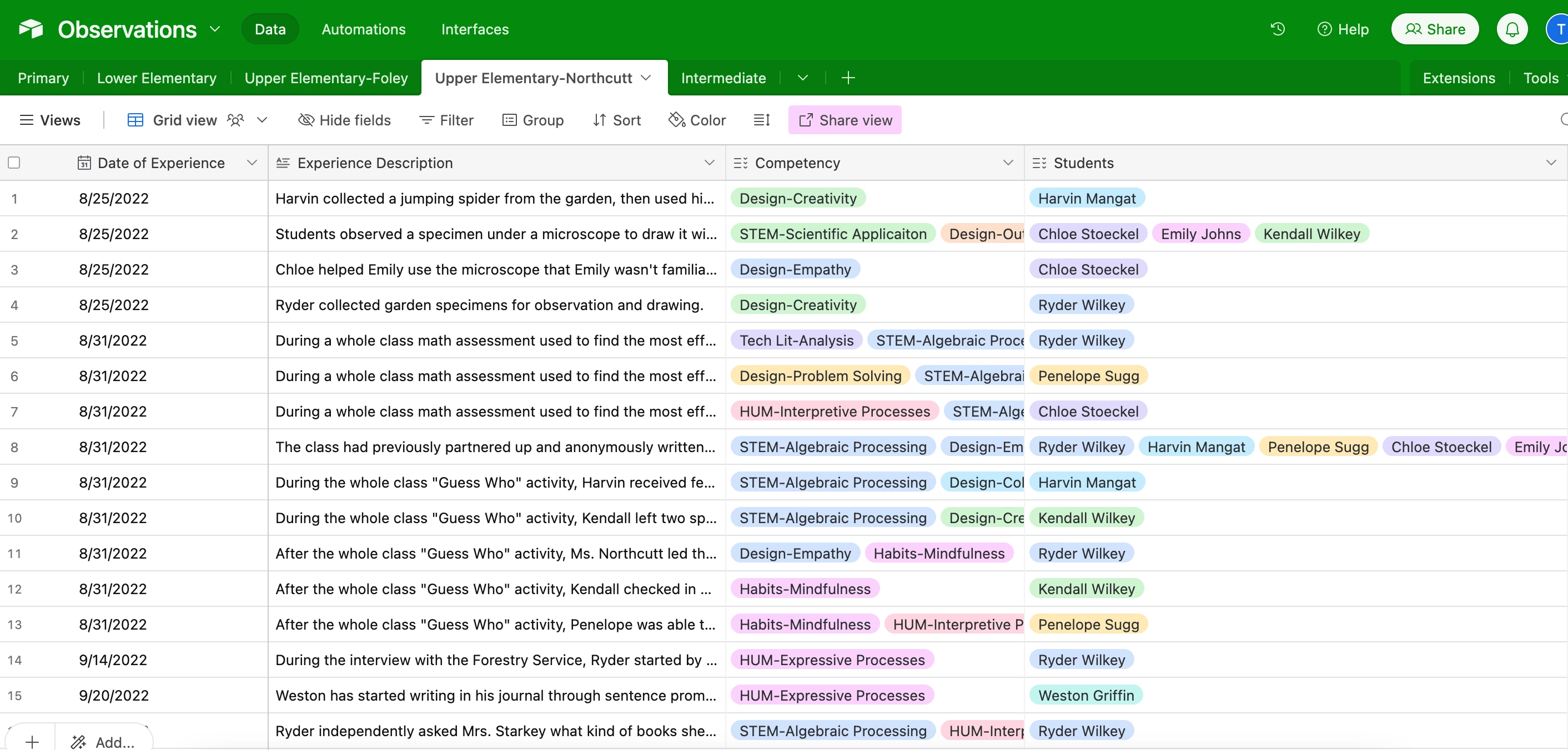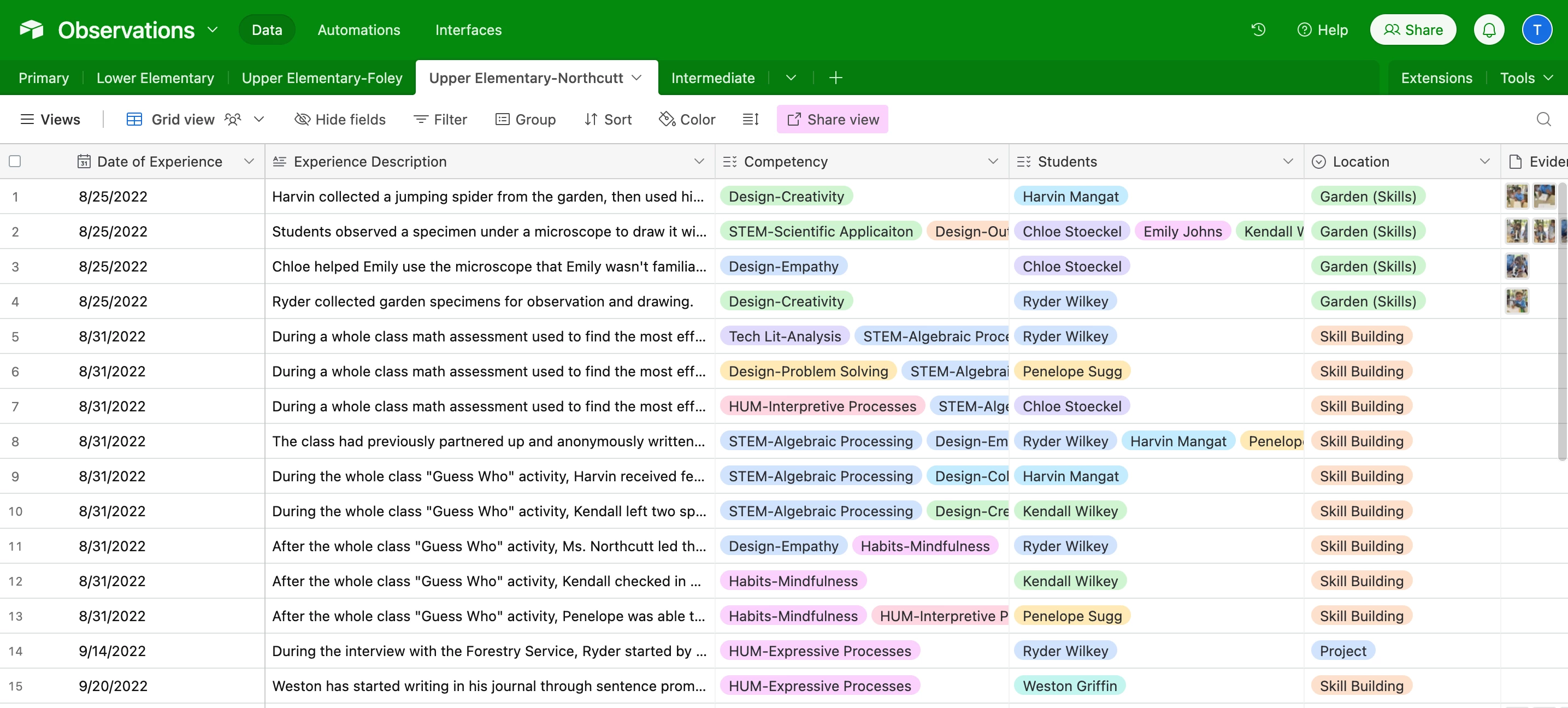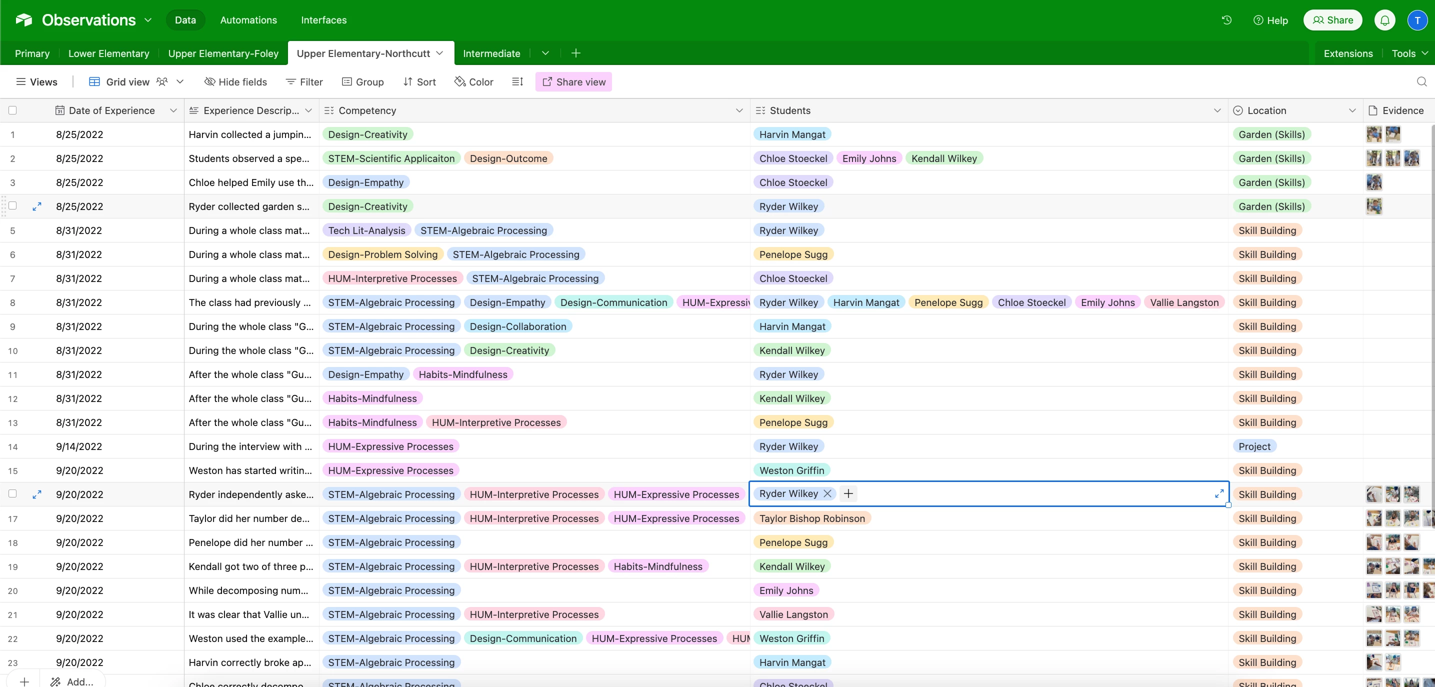 I am working on maintaining student learning records. I have two multiple select fields: one with "Student" names and one with demonstrated "Competency". I would love to create new rows for each combination of Student and Competency, and copy over the same Date, Experience Description, and Location. For example, record number 2 on the screenshots,, I would like one record with the same date/description/location for Chloe/STEM-Scientific Application, one record with the same date/description/location for Chloe/Design-Outcome, one record with the same date/description/location for Emily/STEM-Scientific Application, Emily/Design-Outcome, one record with the same date/description/location for Kendall/STEM-Scientific Application, and one record with the same date/description/location for Kendall/Design-Outcome.