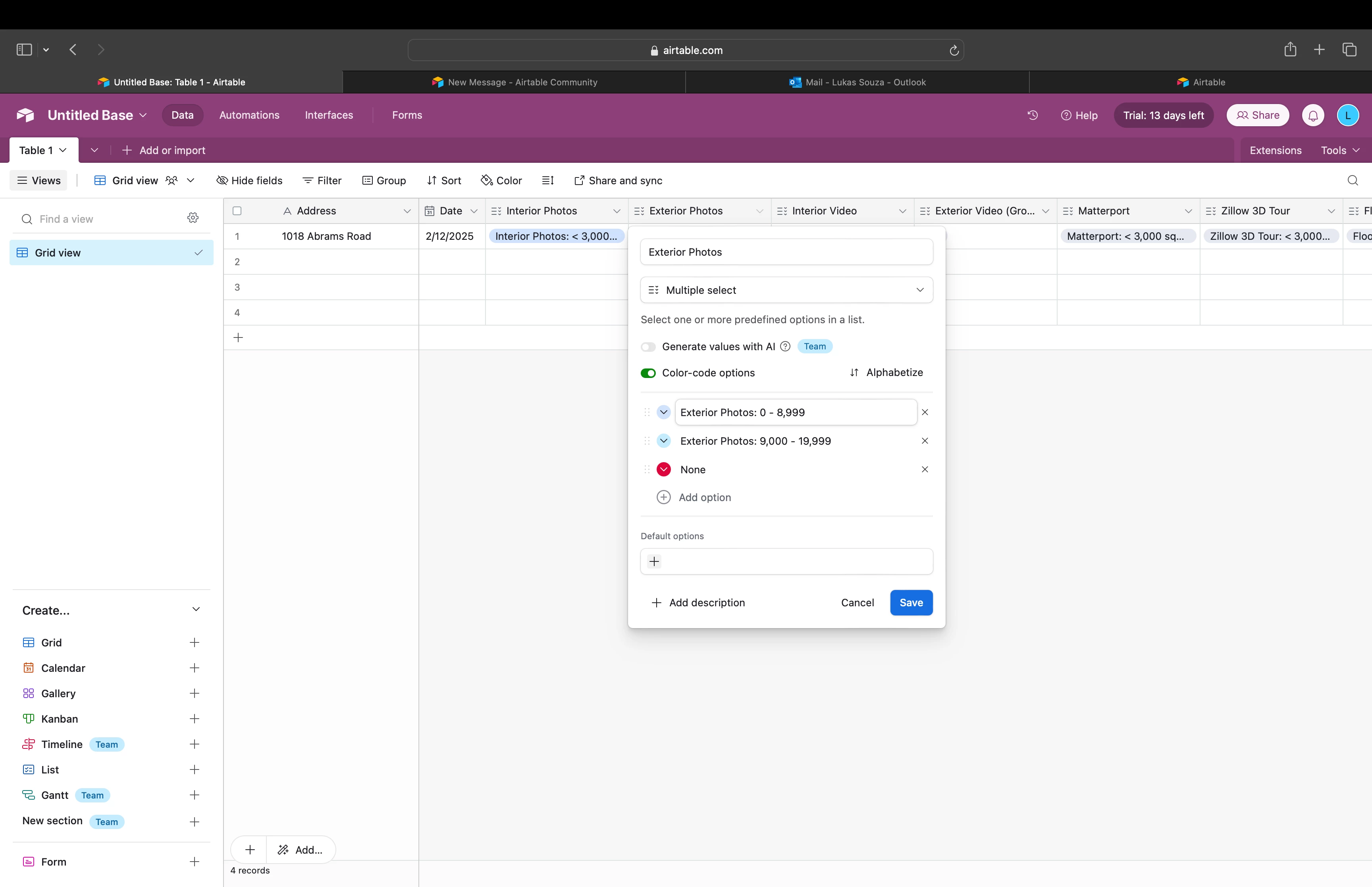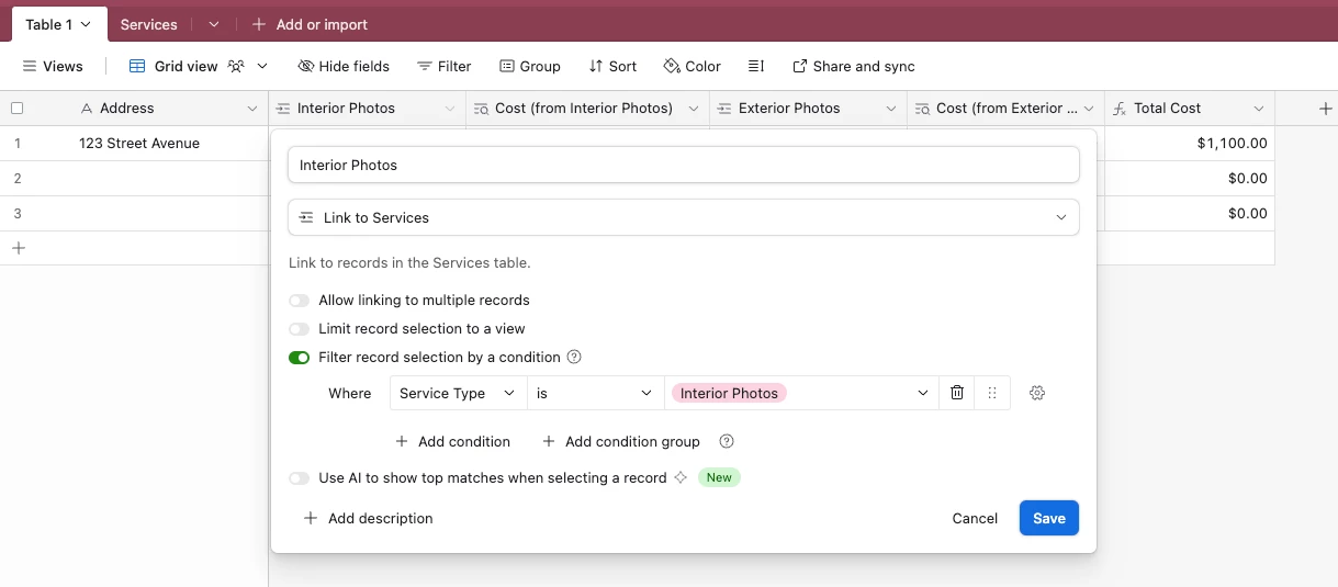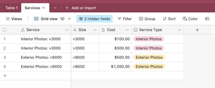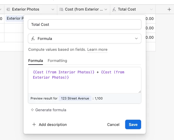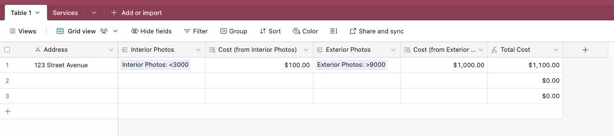 First column is interior photos. There are four potential options in that field, so I need a formula that will calculate based on the selection I make in each column. And the same goes for every other one.