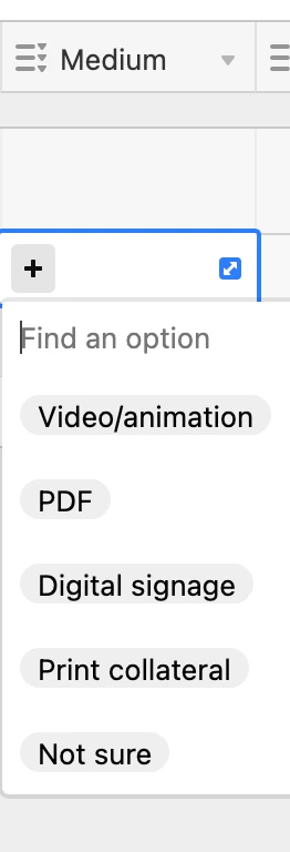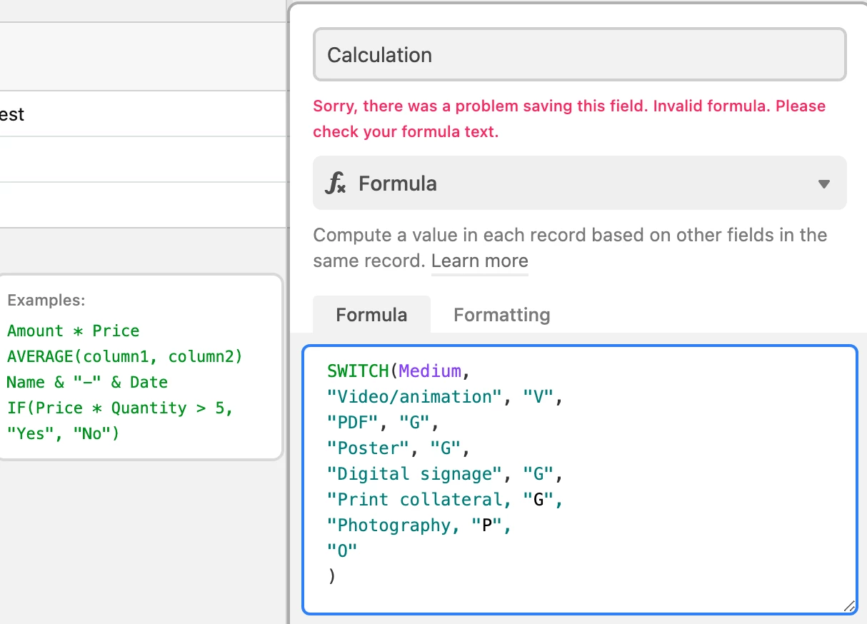 In my Airtable, I have a multiple select field where you can choose different available mediums. (Video, animation, poster, pdfs etc). And I want to create another column that automatically changes depending on what is selected. If video or animation is selected, a V would appear in the column next to it. If a “poster or PDF” is chosen a G would appear.