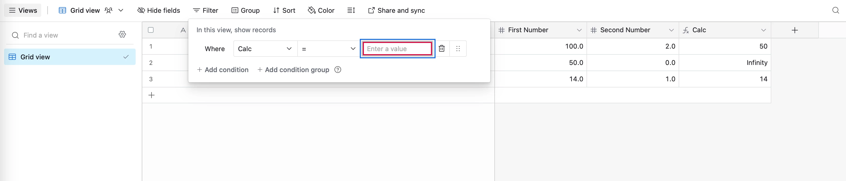 The first screenshot shows the data and that there is one value with Infinity. When I try to use the filter condition to equal the infinity value I am unable to enter the word infinity because it only allows numbers. Next I tried to filter to a value greater then the highest value other then infinity and this filters out everything including the infinity value.