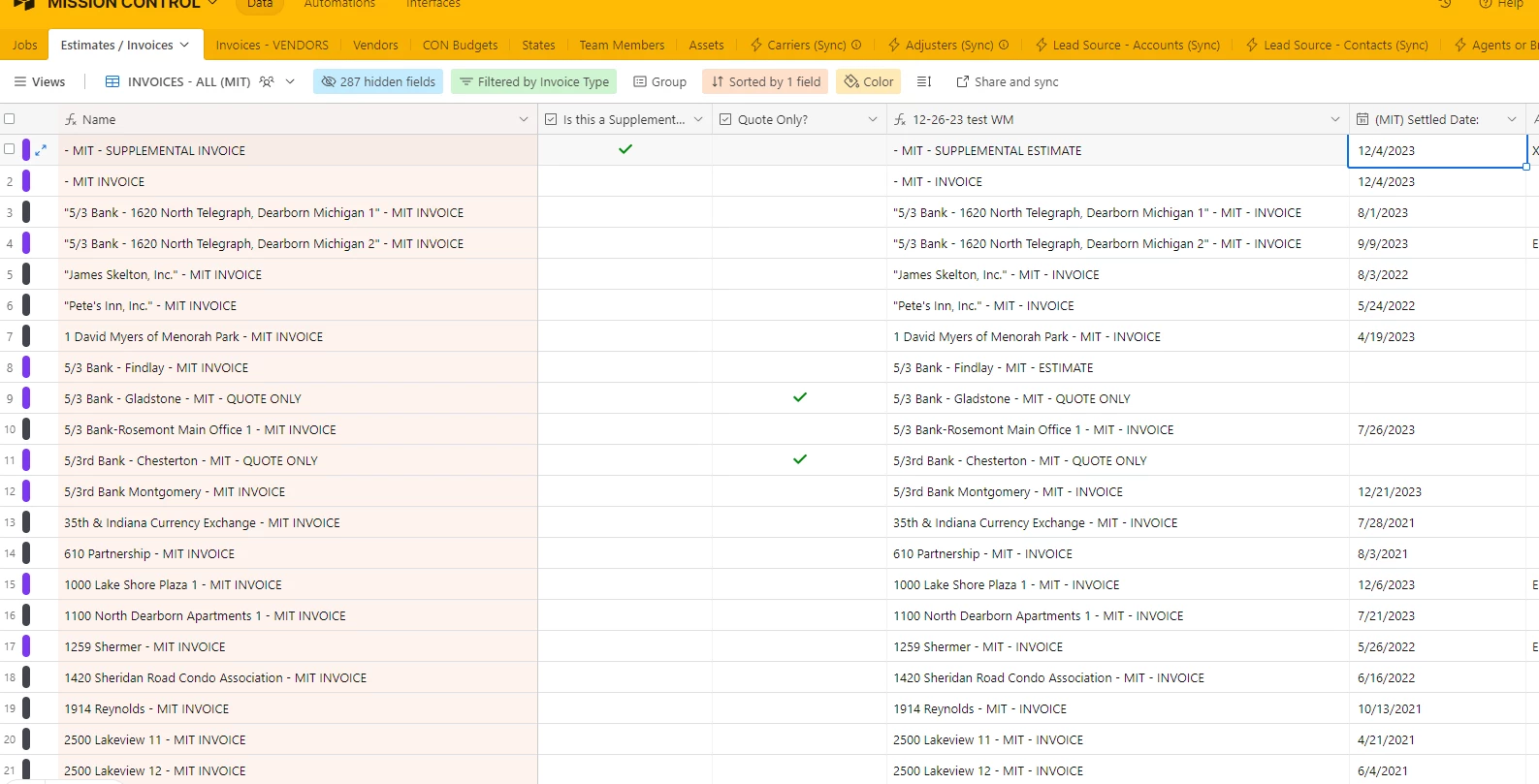 We have the primary field be a concatenation field that takes the name of the customer, the type of work it is, and then looks to the "(MIT) Settled Date" field and if it is empty, uses the word "ESTIMATE" as the last word of the primary name. The thinking here is that when there is no date in the "(MIT) Settled Date" field, it has not been approved - therefore, per above definitions, it is not an Invoice yet but still an Estimate. This works fine. My problem is with the "Quotes" and "Supplementals".