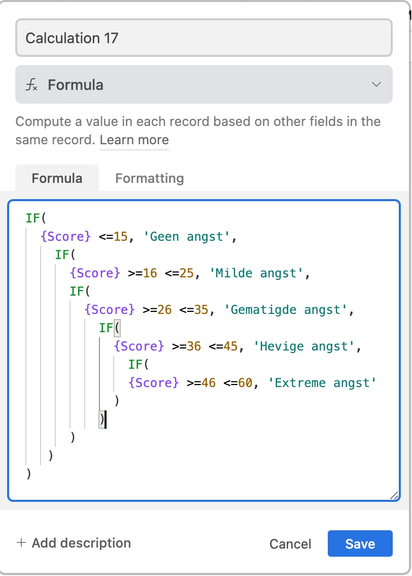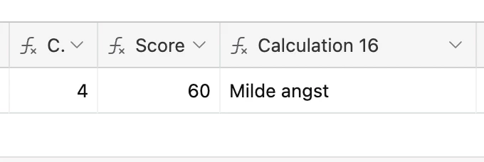 I have a survey set up with 5 of outcomes depending on the total amounts of points. To assign a certain score to a certain outcome I used the IF statement. See attached files. It does not work properly for at 60 points it should show 'Extreme angst'.