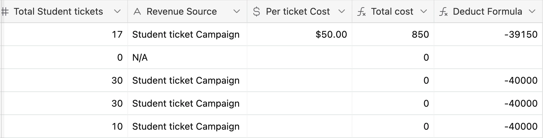 Right now, I have "IF({Revenue Source}="X", {Total cost}-40,000)", but it's returning 0. Any tips? Thank you!!