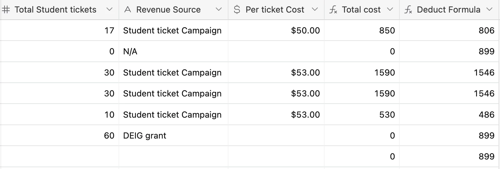 Hello, I want to calculate the total cost per tickets ONLY IF they are a specific type, and then I want to deduct that from a total amount that I set manually. My fields are currently set up: