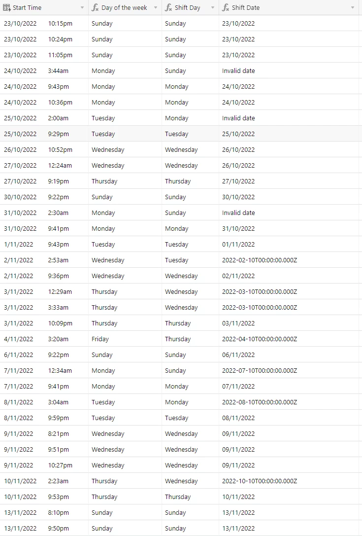I am trying to make a formula that takes the date/time from a previous column, and if the time is in the p.m, display the current date, however, if the time is in the a.m, to display the previous day's date. Attached it my current formula, which works for the p.m. times, but shows a mixture of 'Invalid Date' and an oddly specific time (see photos)