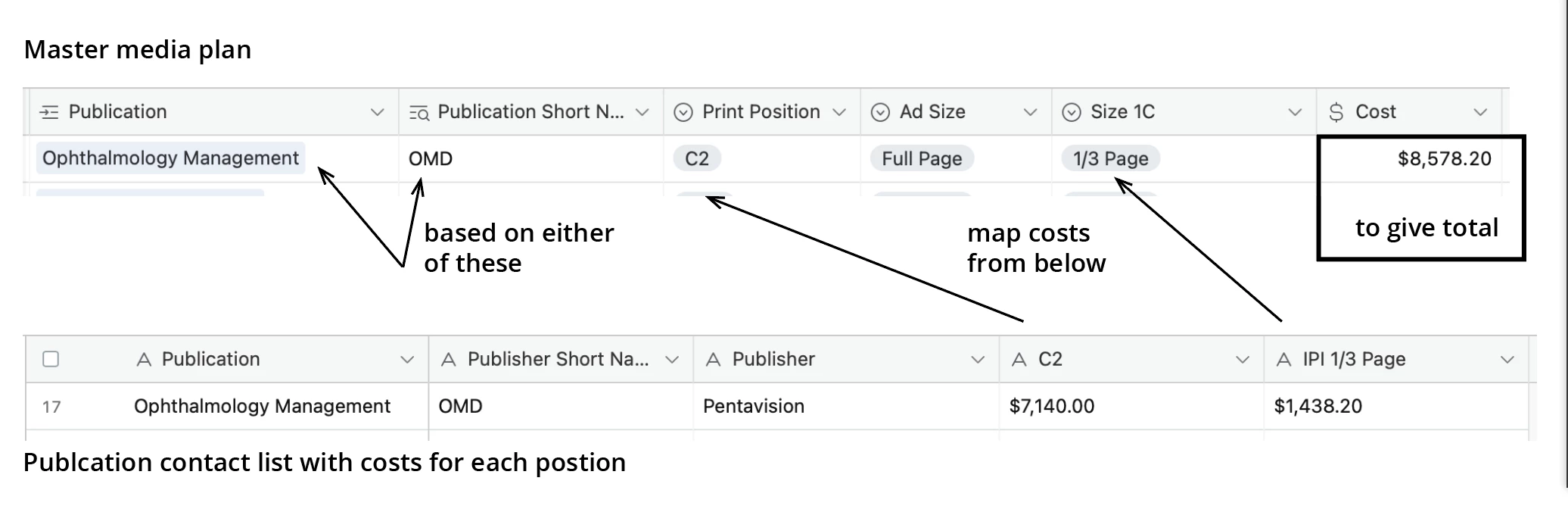 Attached is screen capture of my media planning table and costs table with how I am trying to map costs. Is what I'm trying to achieve possible and/or is there a better way? I tried searching for a solution first and could not locate a similar request so if you know of link to send me to that would be great.