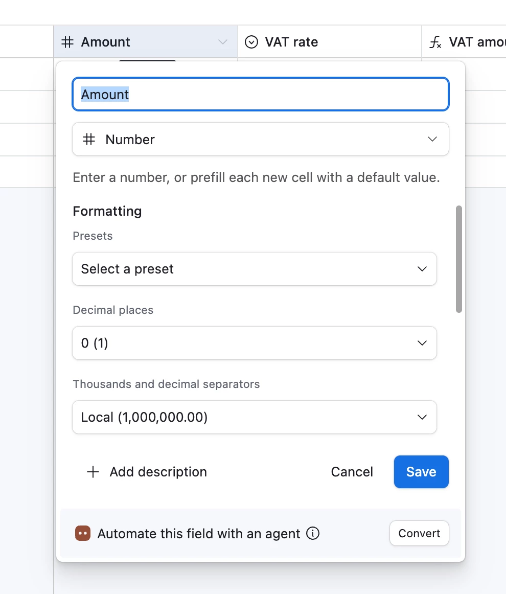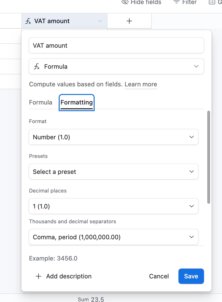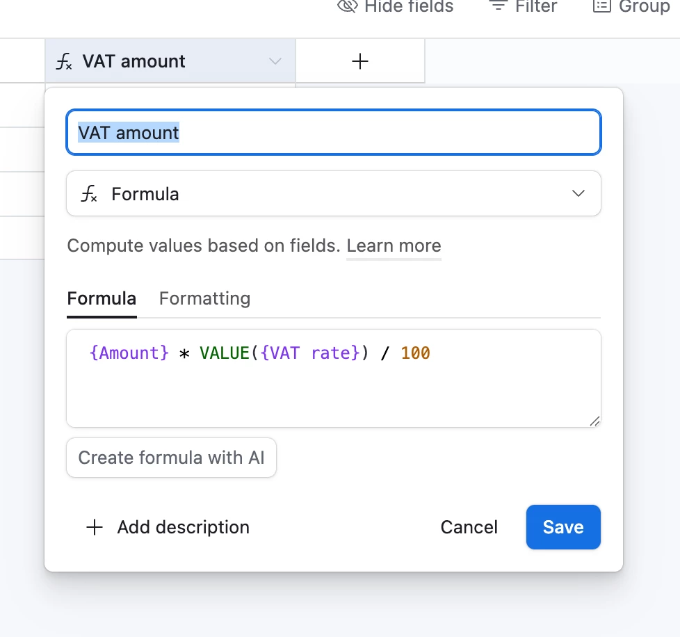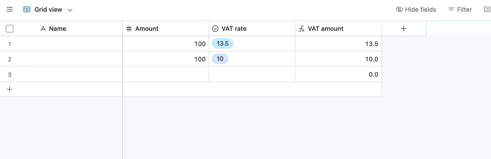 VAT amount | formula | {Amount (Net)} * VALUE(SUBSTITUTE({VAT Rate}, "%", "")) / 100