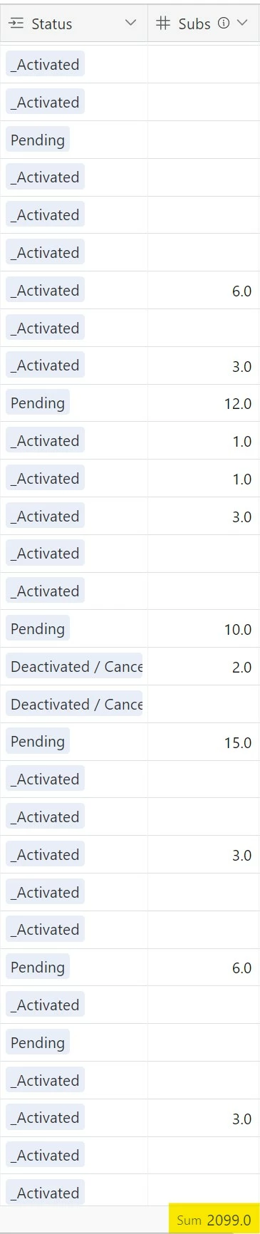 Status field is currently linked to an activations summary table, which totals nominated subscribers activated and those deactivated. Just need a way of calculating true 'pending' subscriptions against total contracted/sold subscriptions.