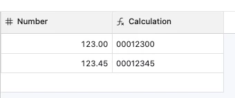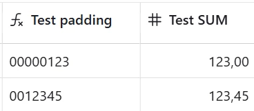 RIGHT("00000000" & {Test SUM},8)However, in my scenario I have decimals and that doesn’t work, since a number 10.00 will count as 2 digits while 10.11 counts as four digits. Hence the padding will be off.