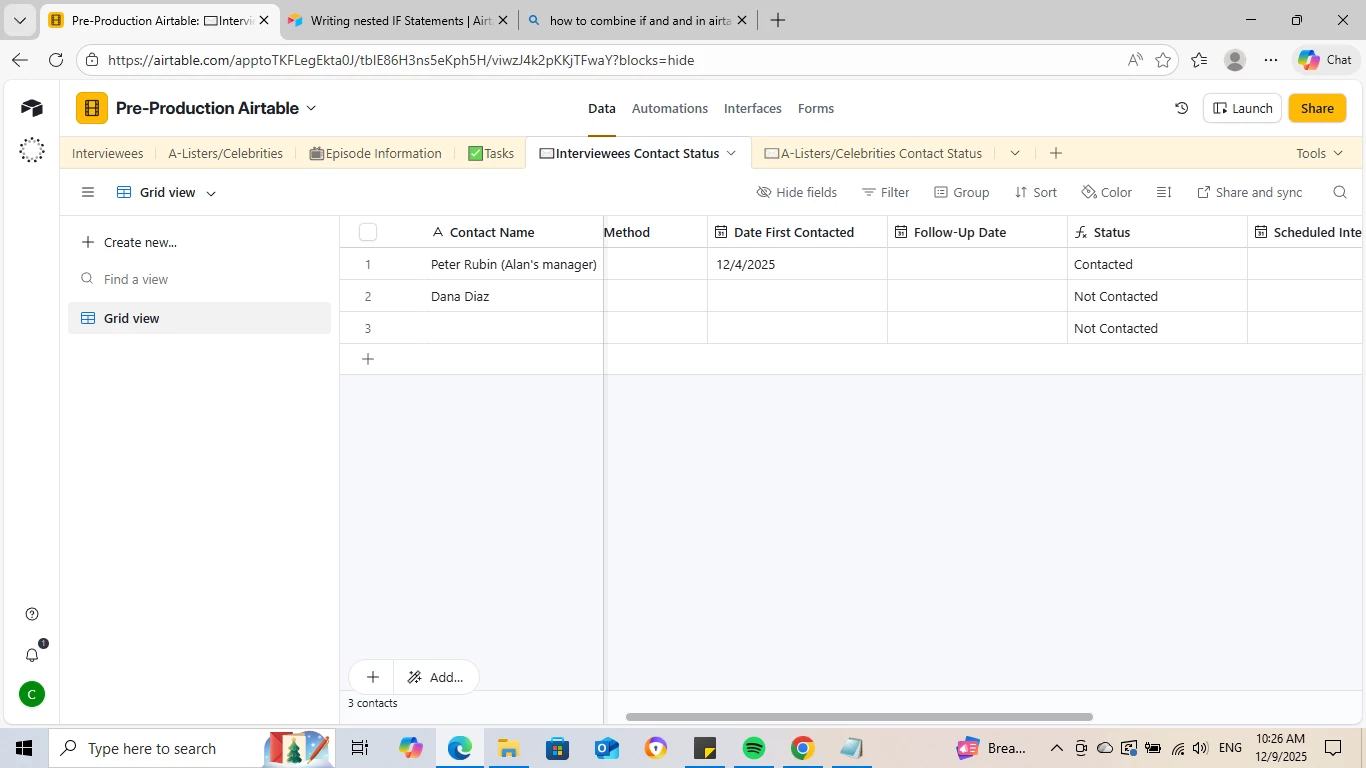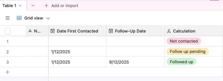 - IF the ‘Date First Contacted ‘= not blank and ‘Follow-Up Date’ = not blank, status = “Followed up.”