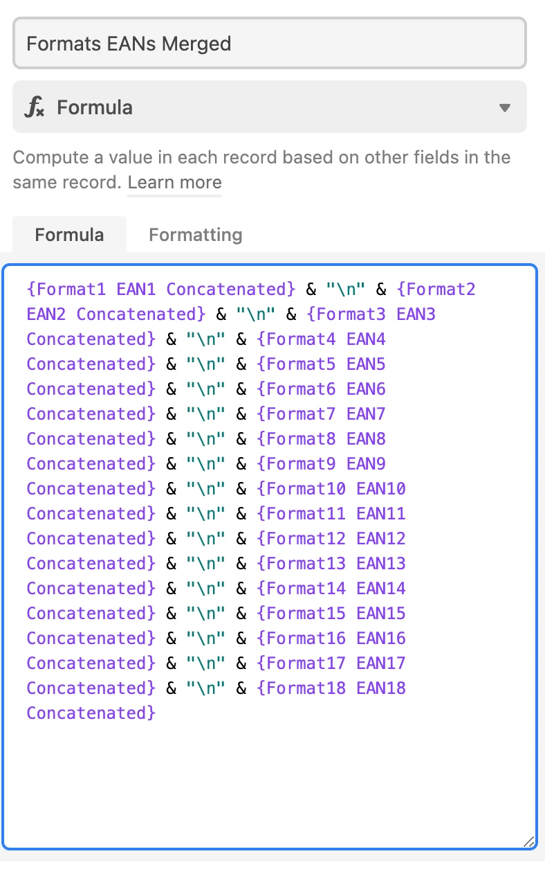 {Format1 EAN1 Concatenated} & "\n" & {Format2 EAN2 Concatenated} & "\n" & {Format3 EAN3 Concatenated} & "\n" & {Format4 EAN4 Concatenated} & "\n" & {Format5 EAN5 Concatenated} & "\n" & {Format6 EAN6 Concatenated} & "\n" & {Format7 EAN7 Concatenated} & "\n" & {Format8 EAN8 Concatenated} & "\n" & {Format9 EAN9 Concatenated} & "\n" & {Format10 EAN10 Concatenated} & "\n" & {Format11 EAN11 Concatenated} & "\n" & {Format12 EAN12 Concatenated} & "\n" & {Format13 EAN13 Concatenated} & "\n" & {Format14 EAN14 Concatenated} & "\n" & {Format15 EAN15 Concatenated} & "\n" & {Format16 EAN16 Concatenated} & "\n" & {Format17 EAN17 Concatenated} & "\n" & {Format18 EAN18 Concatenated}
