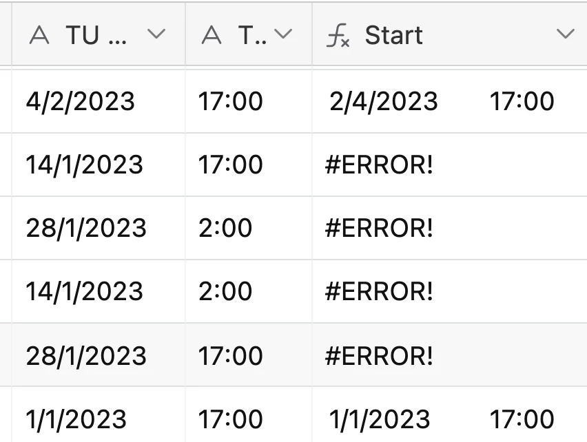 Two fields, one date (as text type) one time (as text type) - The formulae field SHOULD make these into a single date/time field - This is the formulae I have, but I get errors on any dates with two characters as the day - I have tried various formatting DD/MM etc with no joy!.