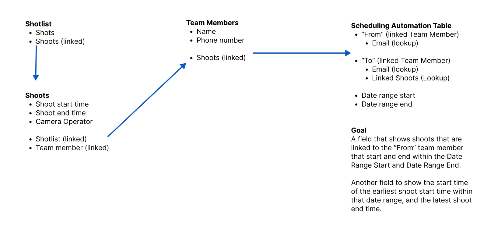 In my "Scheduling" table, I want to be able to enter a single date, or a start and end date. This field will look at all Shoots linked to the Team Member that is linked to this record, and spit back out a list of Shoots that have a start and end date/time that is within the dates I specified in the Scheduling table.