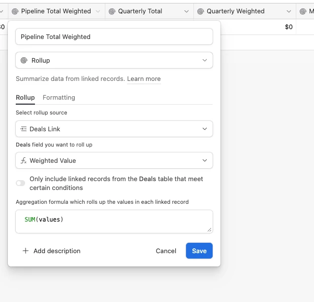 I have a table called Deals with many different fields but one of them is a currency field that i want to use a rollup field in another table to calculate the sum of the values in this currency field.