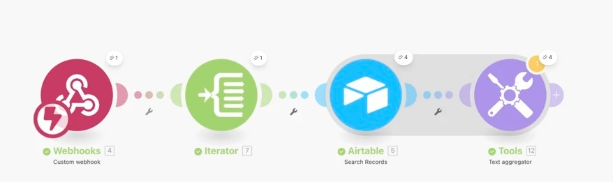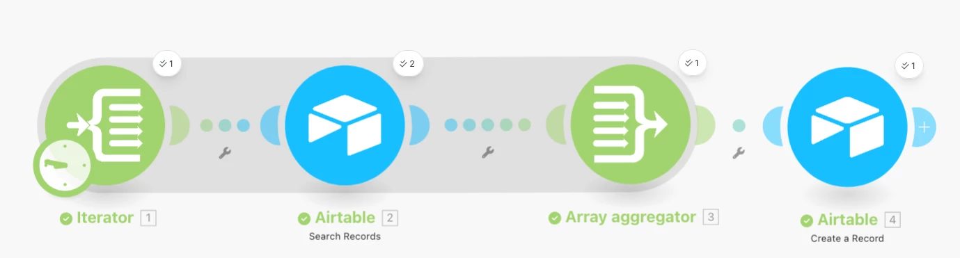 However, instead of producing one operation with all the matching results flattened, it’s currently returning the same number of operations as the Airtable Search module (one per iterator loop).