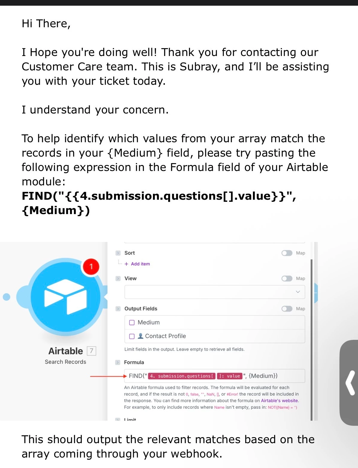 My goal is to flatten all the matching results into a single comma-separated string (one operation), and then use the split() function in my Airtable module’s formula field to turn that string back into an array.