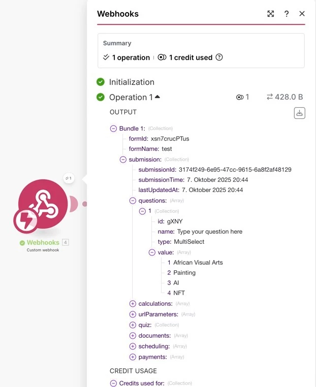 I’m receiving an array from a Fillout form via webhook into Make (see attached image)