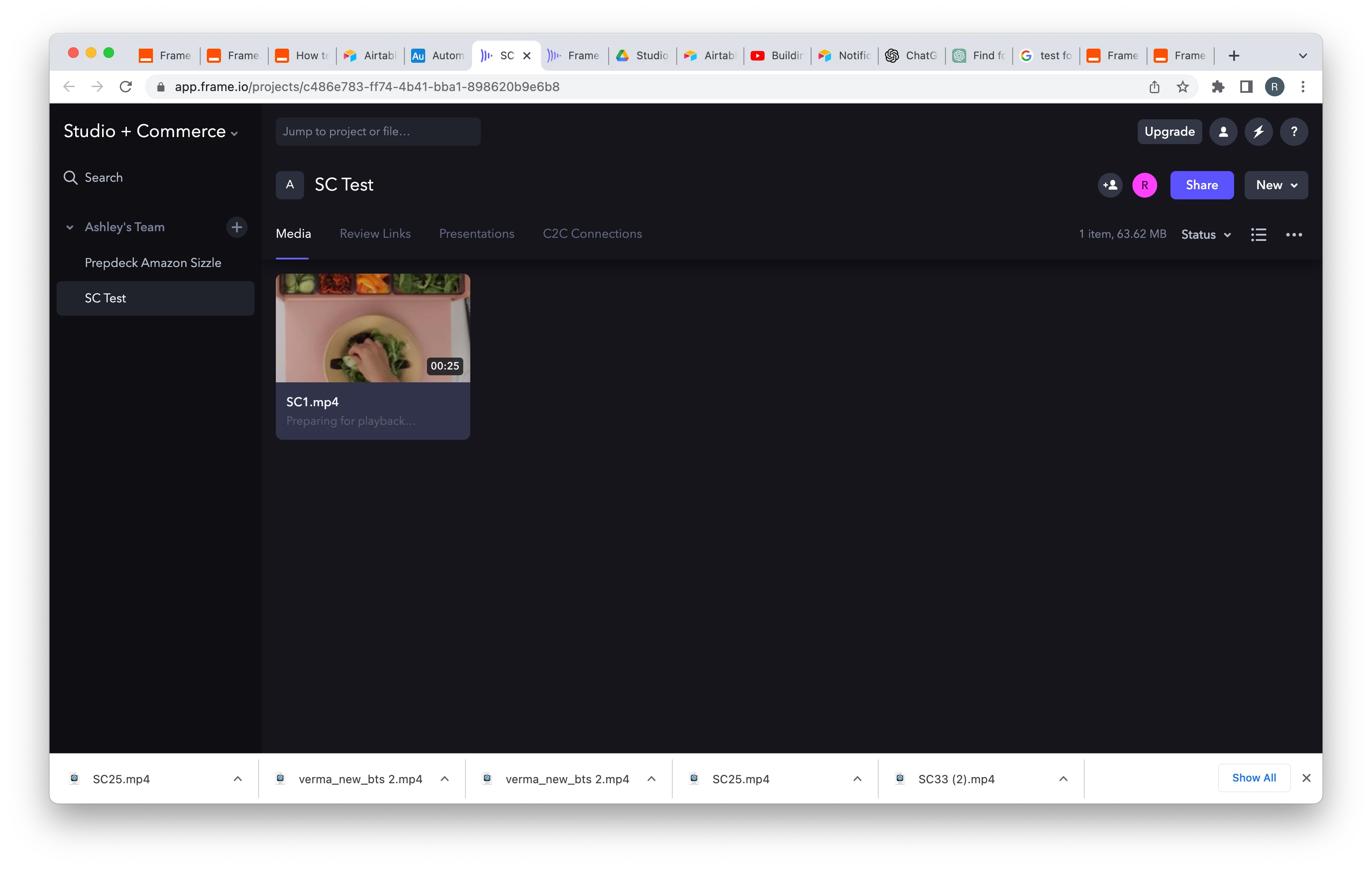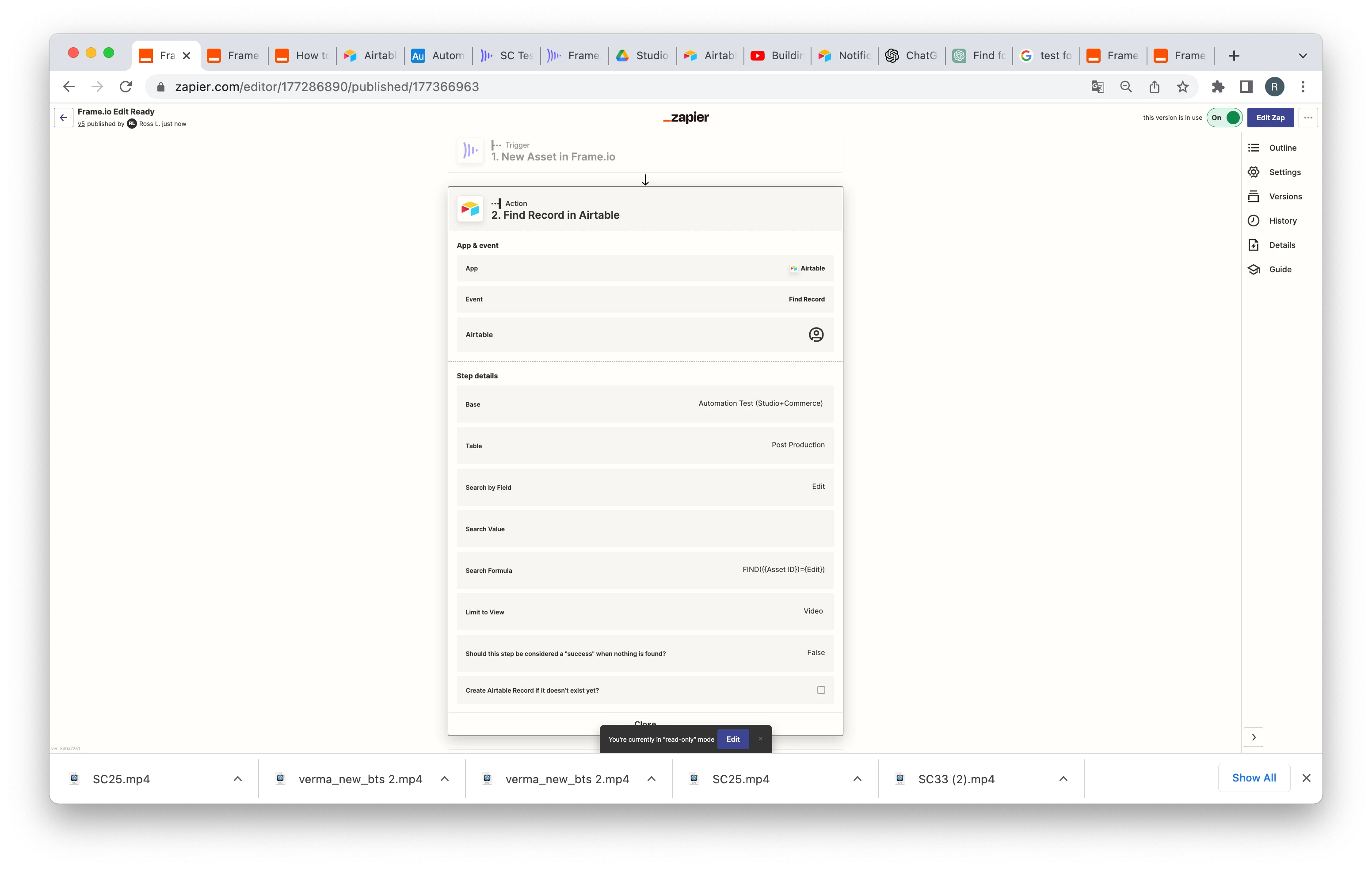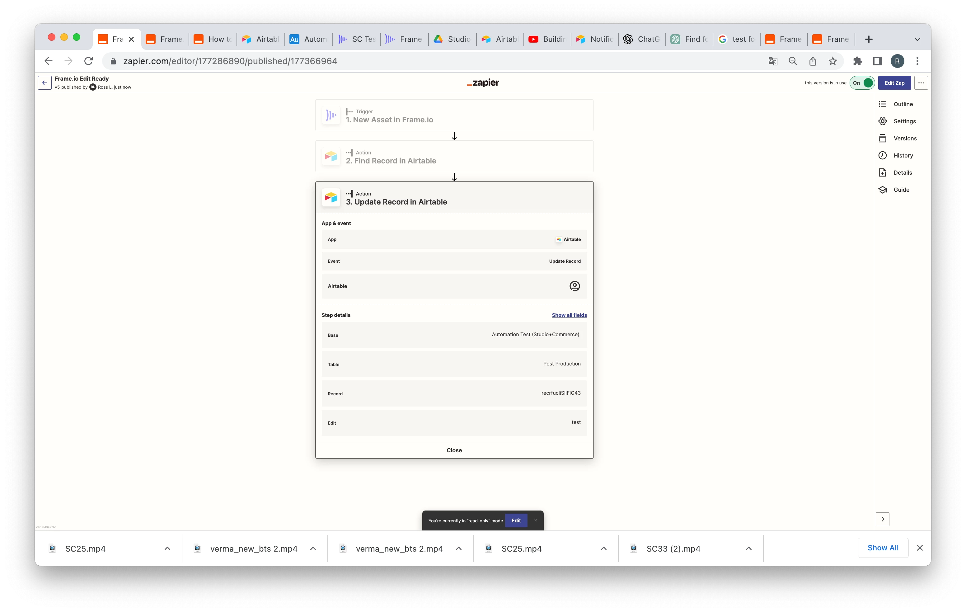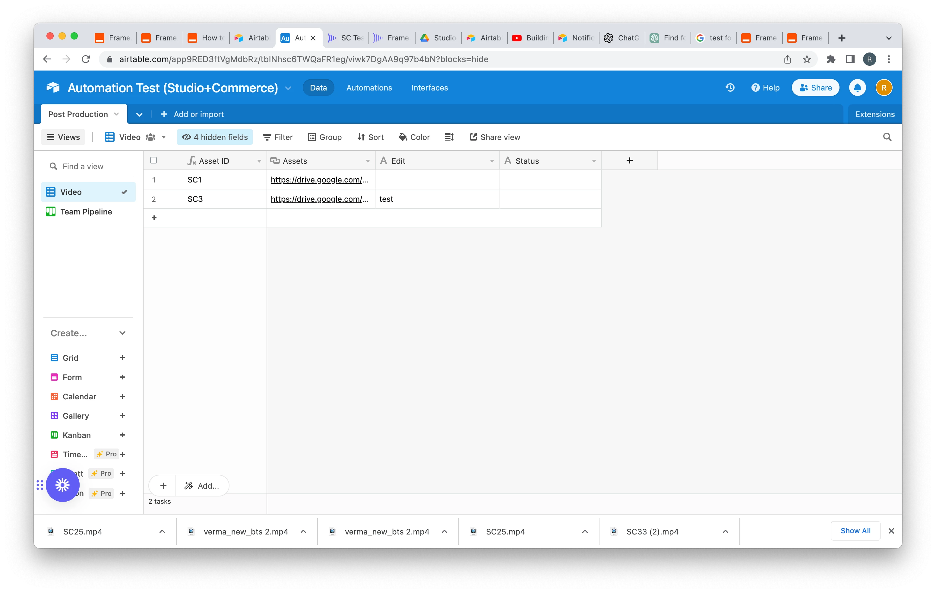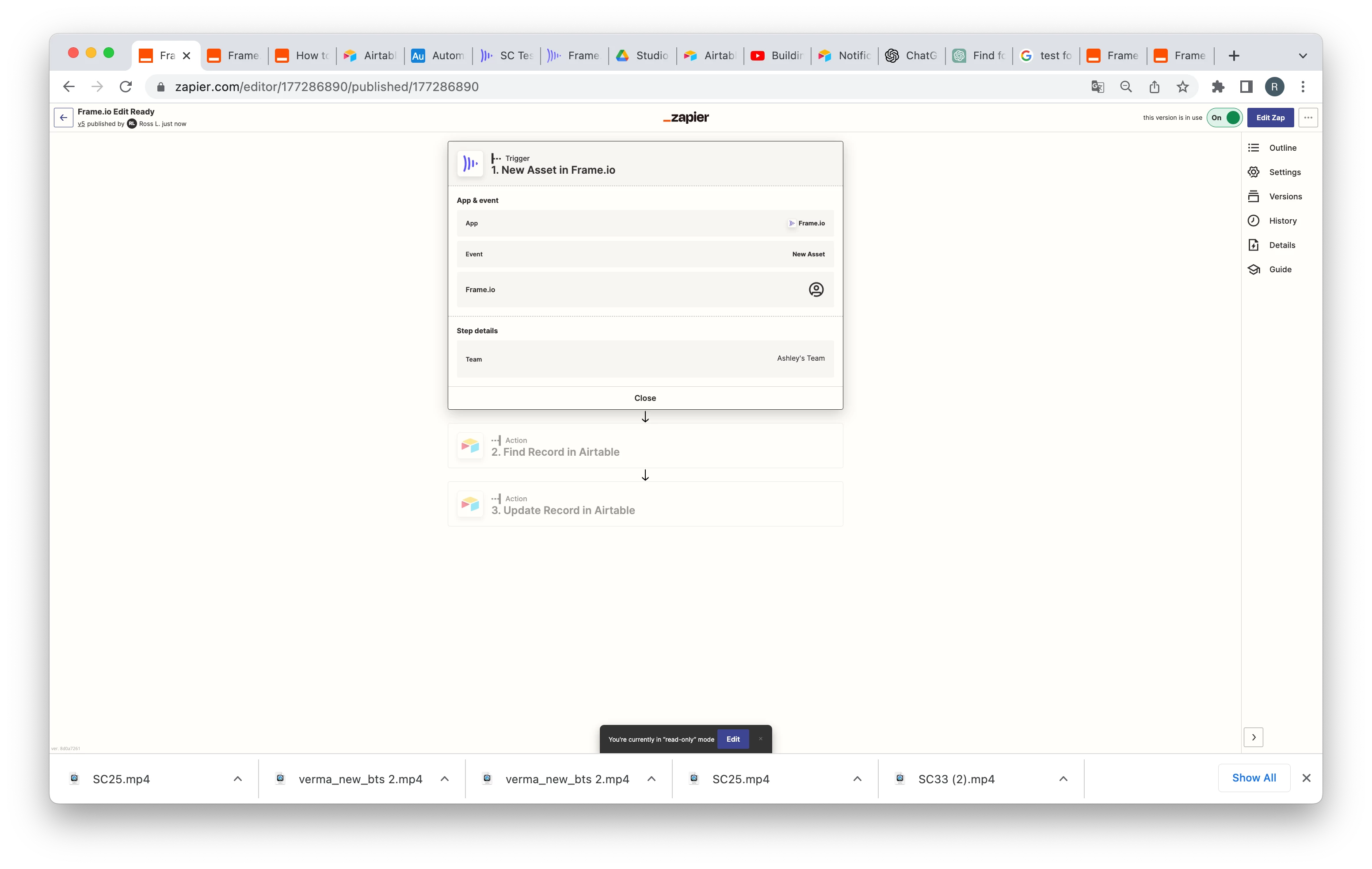 - Uploaded video To frame.io where the name of the video is the same as a Unique ID in airtable ( called Asset ID ) in Airtable