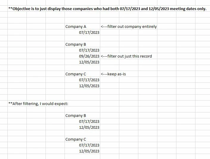 I've got a handful of companies that had meetings taking place on various dates. I want to filter out those companies who did not meet on both 07/17/2023 and 12/05/2023. For example, if Company A met only on 07/17/2023, it would not be shown. If Company B met on 07/17/2023, 09/26/2023, and 12/05/2023, only the July and December meeting dates would be shown. If Company C met on 07/17/2023 and 12/05/2023 only, that record would be shown as-is. I've attached a file as an example. Thank you!