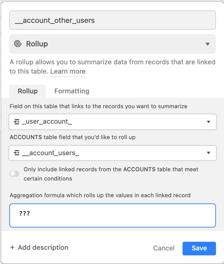 I have a table called 'accounts' and another one called 'users' linked to accounts in a one account to many users relationship. I want to create a field in the table users that shows an array with all the other users in that account except themselves. I wonder if airtable would allow me to do that?